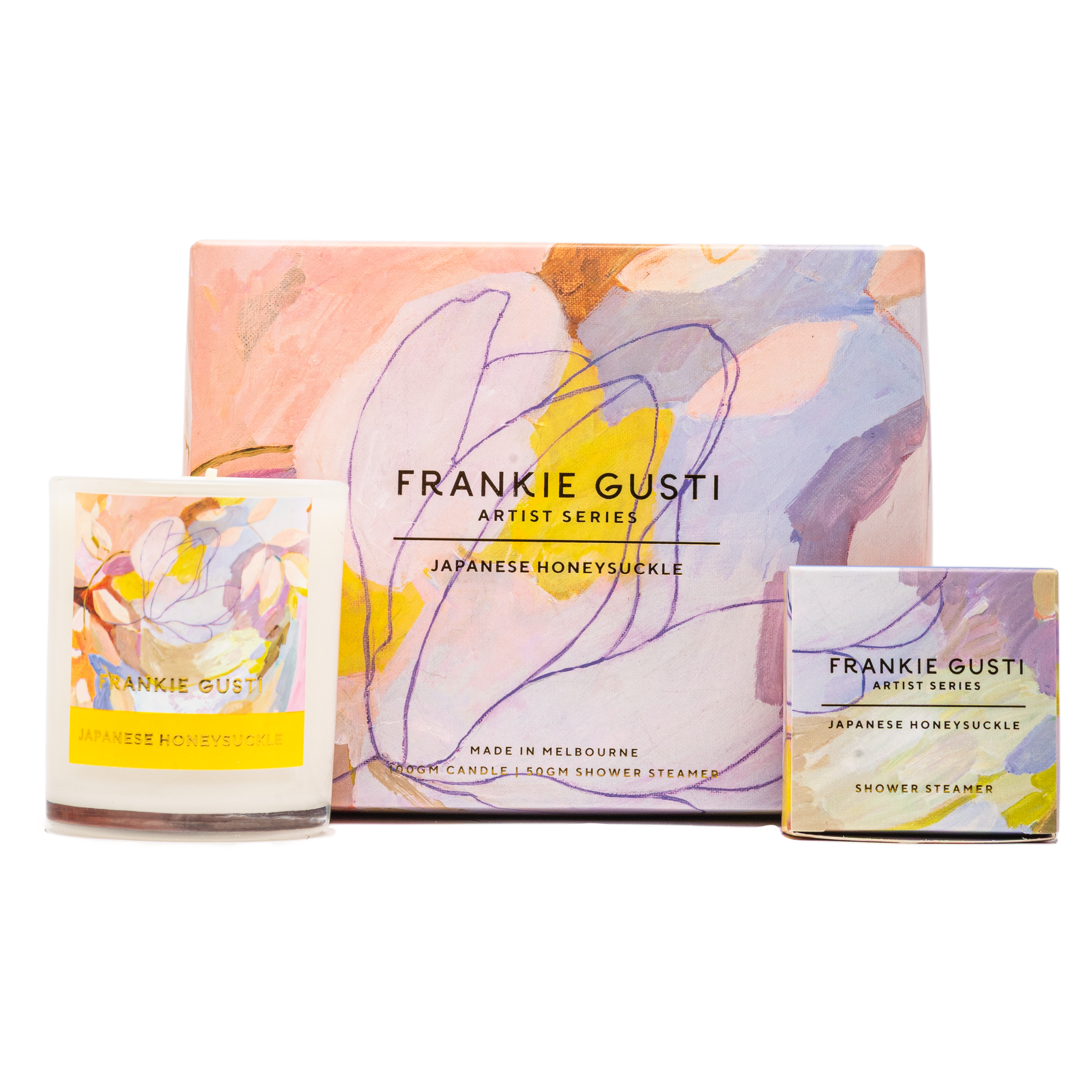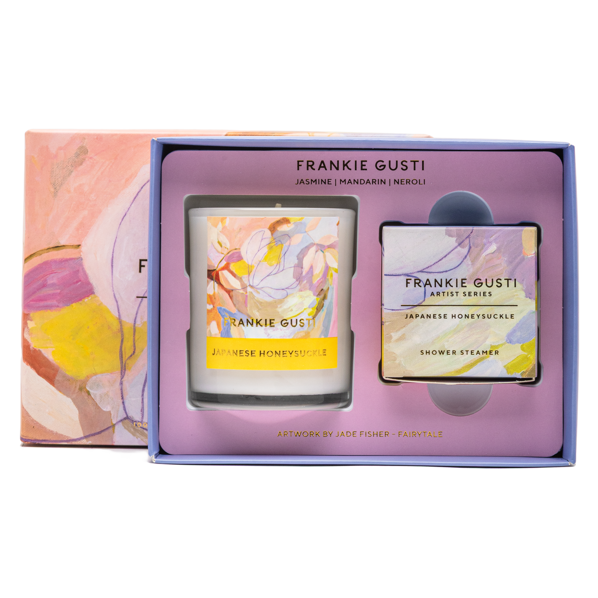 Indulge in some TLC with this luxurious Shower Steamer + Candle duo. 50gm Shower Steamer 100gm Candle. A sweet flowering vine with notes of juicy mandarin, jasmine and Japanese neroli. A blooming fruity floral with pops of citrus and a touch of earthy cedar wood. Artwork by Jade Fisher, Cruelty free + vegan