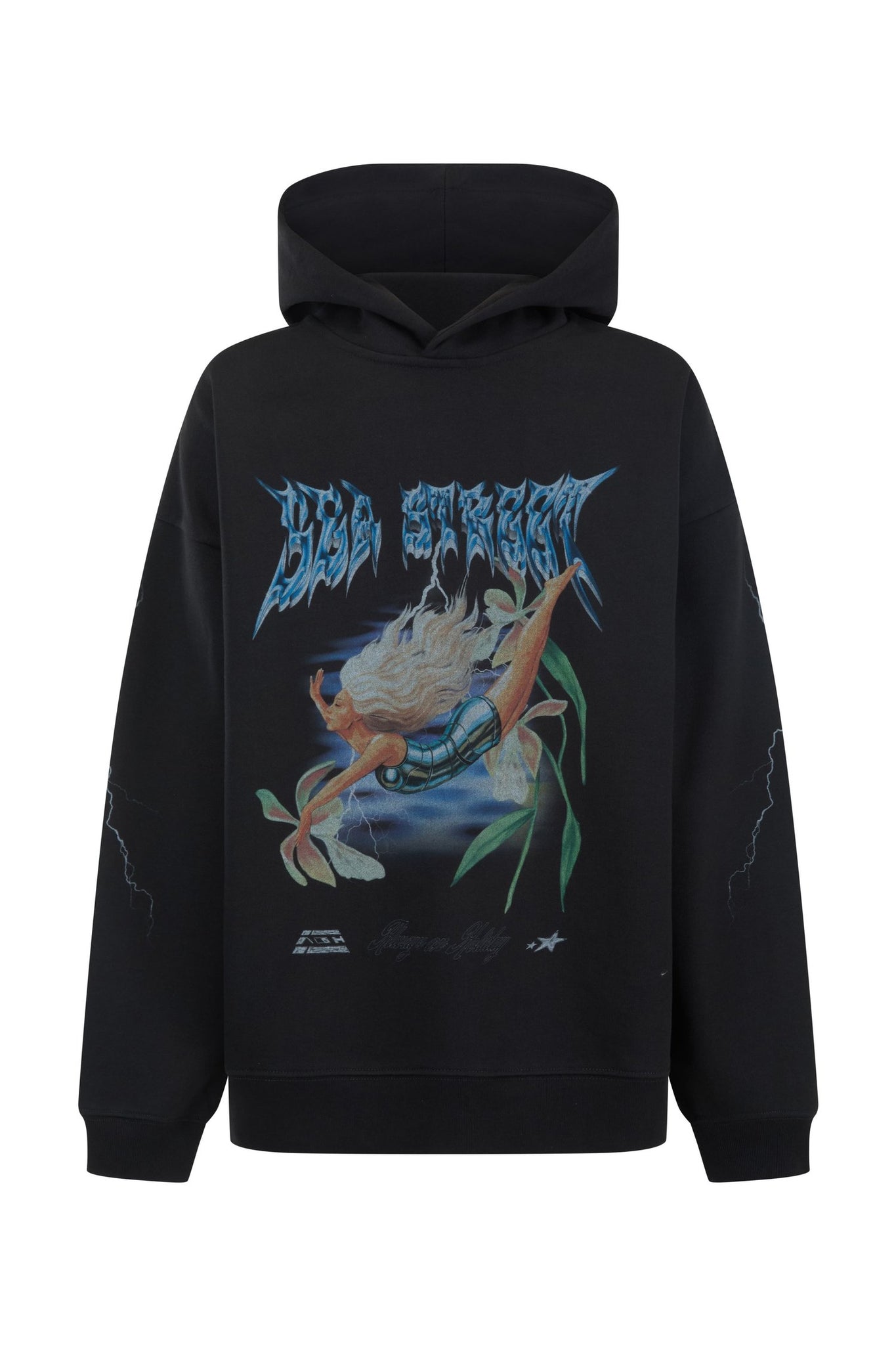Our Hero of the LA Thrift collection is the oversized hoodie featuring the Metallic Diver artwork on washed black cotton. Finished with lightning sleeve details on a washed black with a vintage worn-in feel.