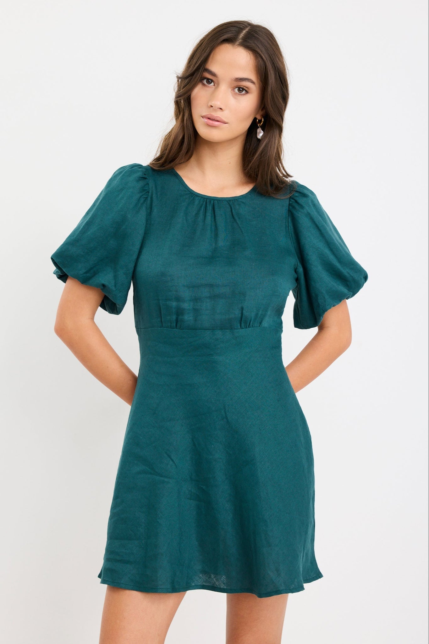 Delphine Forest Linen Puff Sleeve Mini Dress